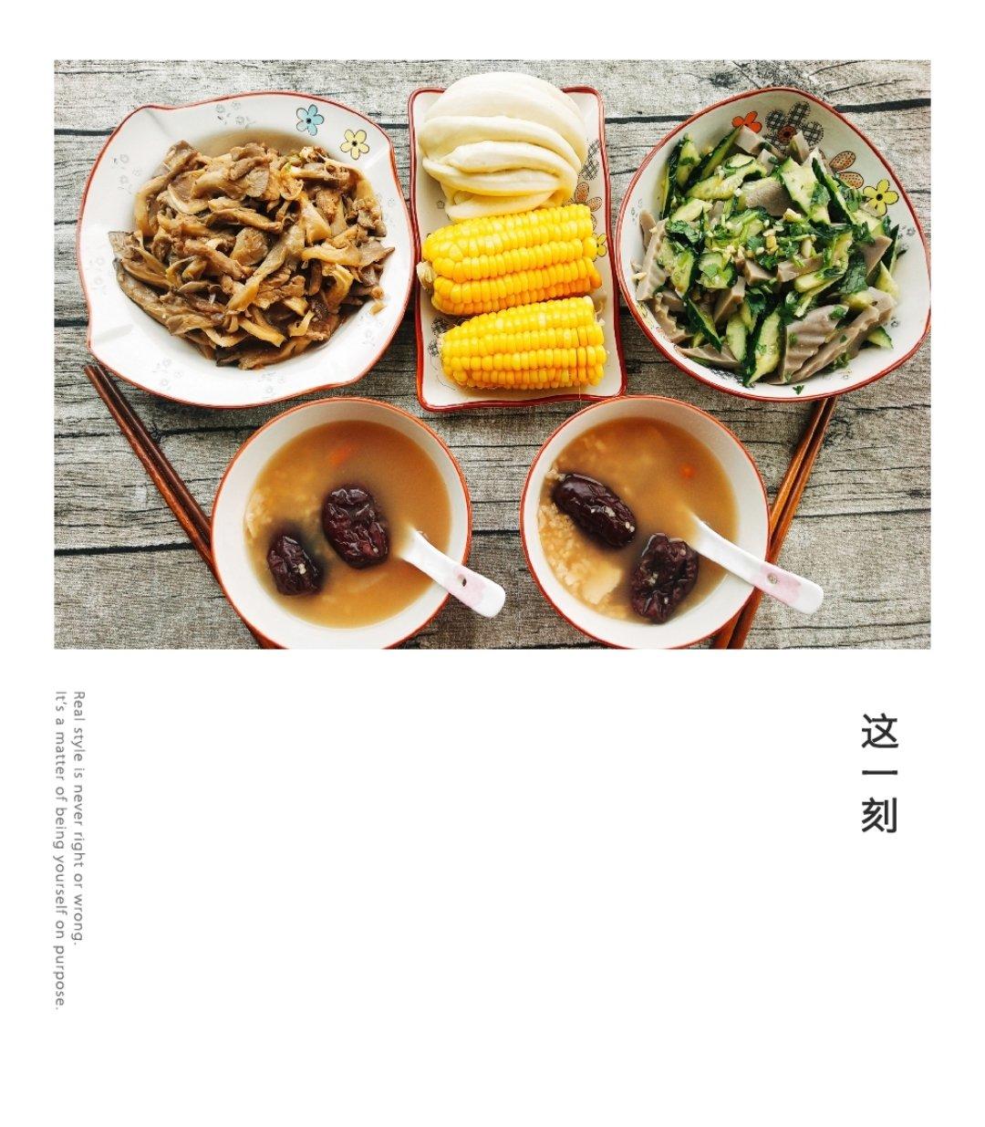 凉拌木耳萝卜丝,一碟卤肉加煎蛋。馒头奶酪抹果酱,玉米粥有卵磷脂。