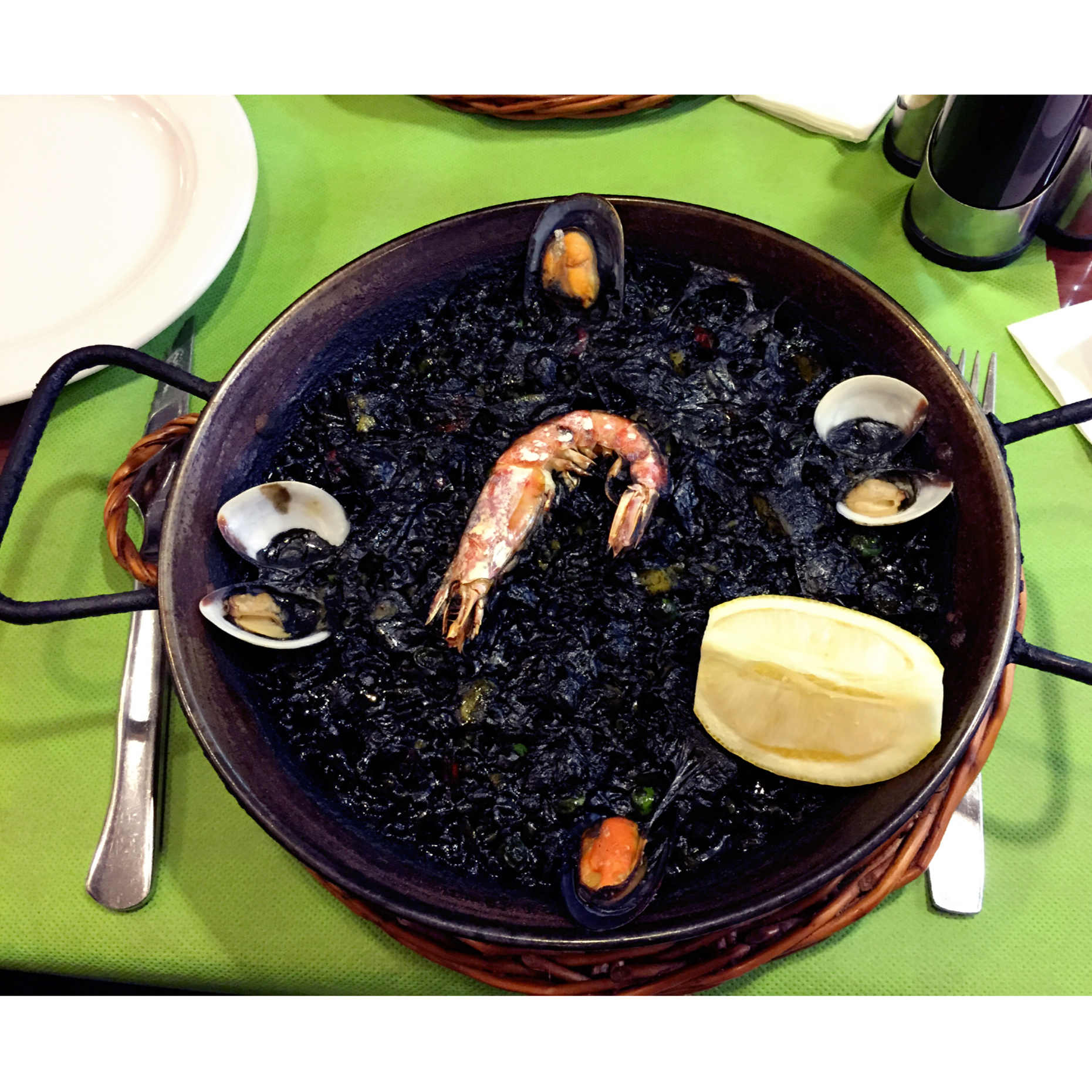 巴塞罗那的海鲜饭,black款墨鱼汁味道浓郁!12.9欧搭配两盘tapas小吃。就是吃完变黑嘴巴,见图二。。。 #早餐•...