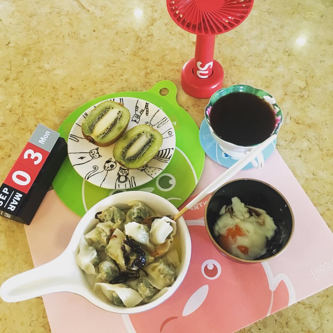 抱蛋煎小馄饨+南瓜百合小米粥+猕猴桃+牛奶
