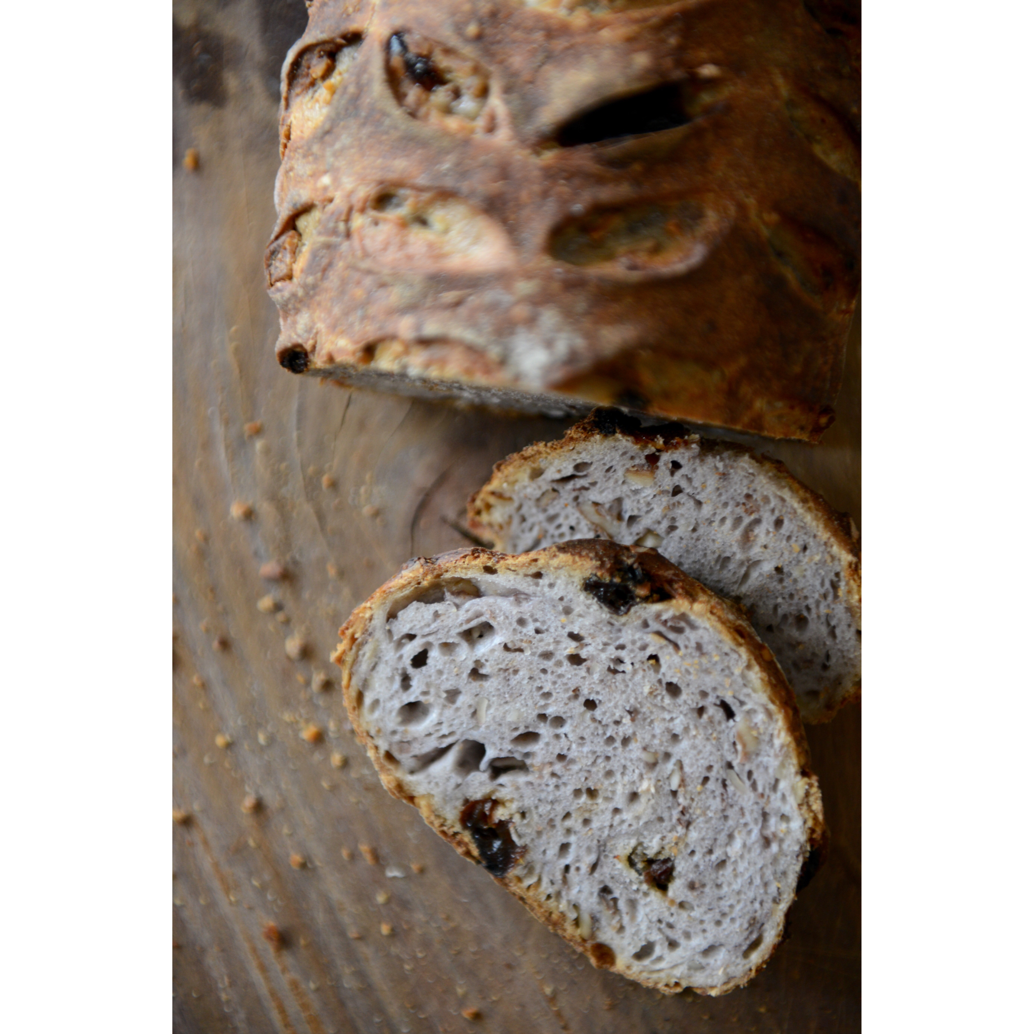 干果在揉面时加入面团颜色确实变深,而且发酵时间缩短了,葡萄干里糖粉让面团更容易发酵。烤完以后乌漆墨黑,切开组织如图,和书...
