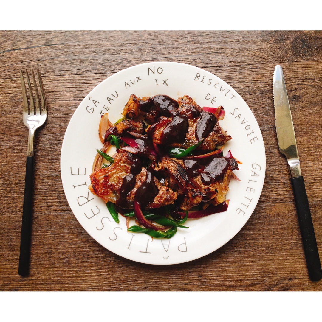 自制牛排,加了黑胡椒汁和洋葱青椒丝,放了一点点橄榄油煎的,用牛排自身煎出的油炒的洋葱青椒,很好吃! #午餐•2016年5...