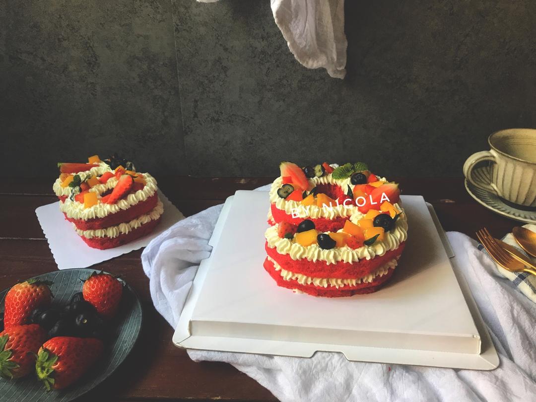 红丝绒戚风,夹了两层水果,端起来有点晃的厉害=(^.^)=