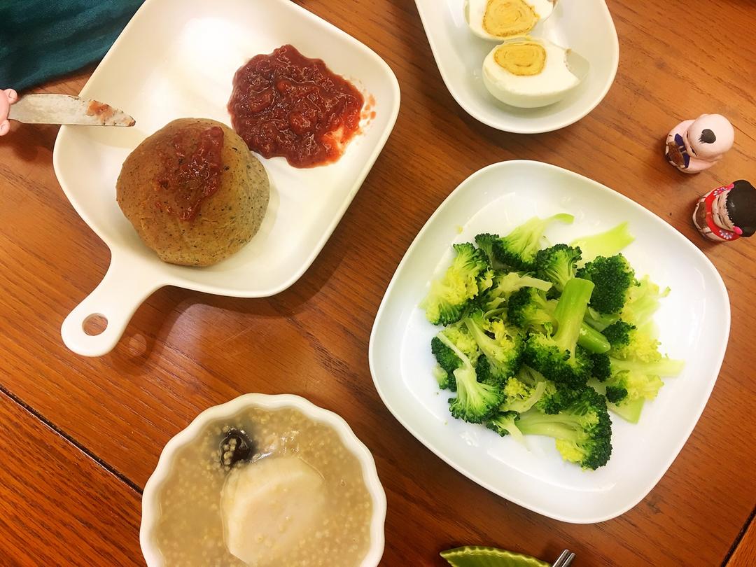 2018年4月3日,周二,早上好!今日早餐:清炒西蓝花,芝麻酱餐包+草莓酱,咸鸭蛋,粥