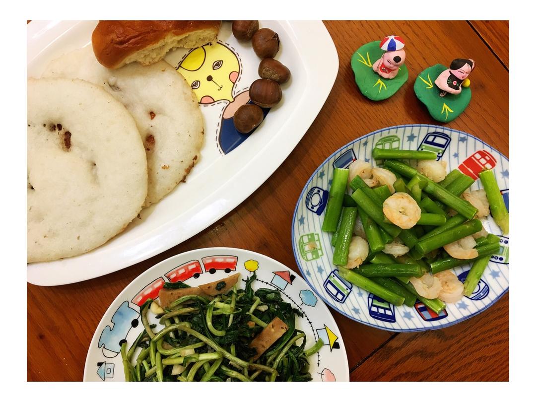 2018年4月1日,周日,早上好!芦笋炒虾仁,马兰头炒午餐肉(自己做的午餐肉),米饭饼+京江脐+板栗,黑豆浆...