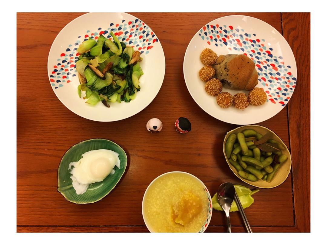 2018年3月22日,周四,早上好!今日早餐:青菜香菇,芝麻酱餐包+红薯奶酪圆子,温泉蛋,盐水毛豆,小米红薯...