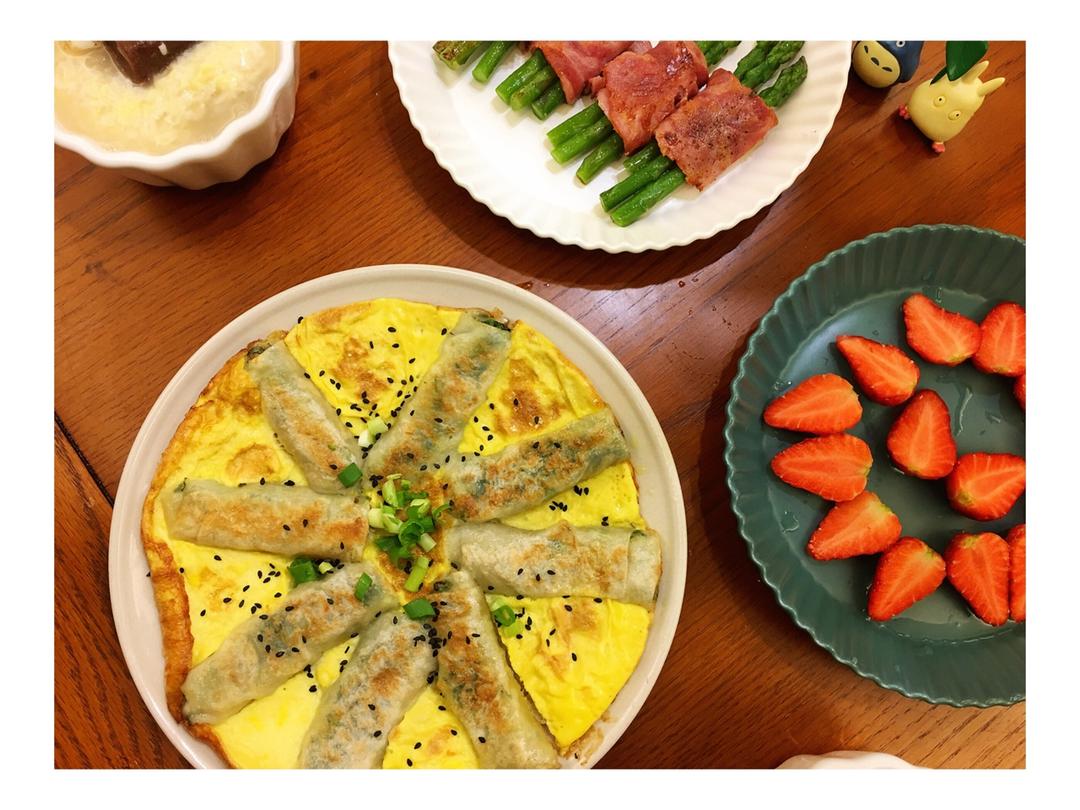 2018年3月31日,周六,早上好!今日早餐:培根卷芦笋,草莓,春款抱蛋,年糕酒酿鸡蛋