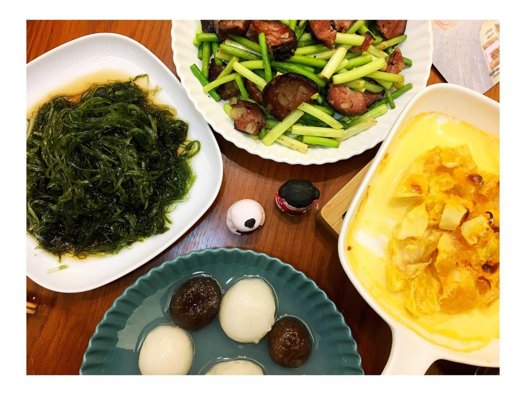 2018年4月6日,周五,早上好!今日早餐:芝士焗红薯,蒜苗炒猪血肠,拌海藻丝,汤圆+藕粉圆子,玉米糊
