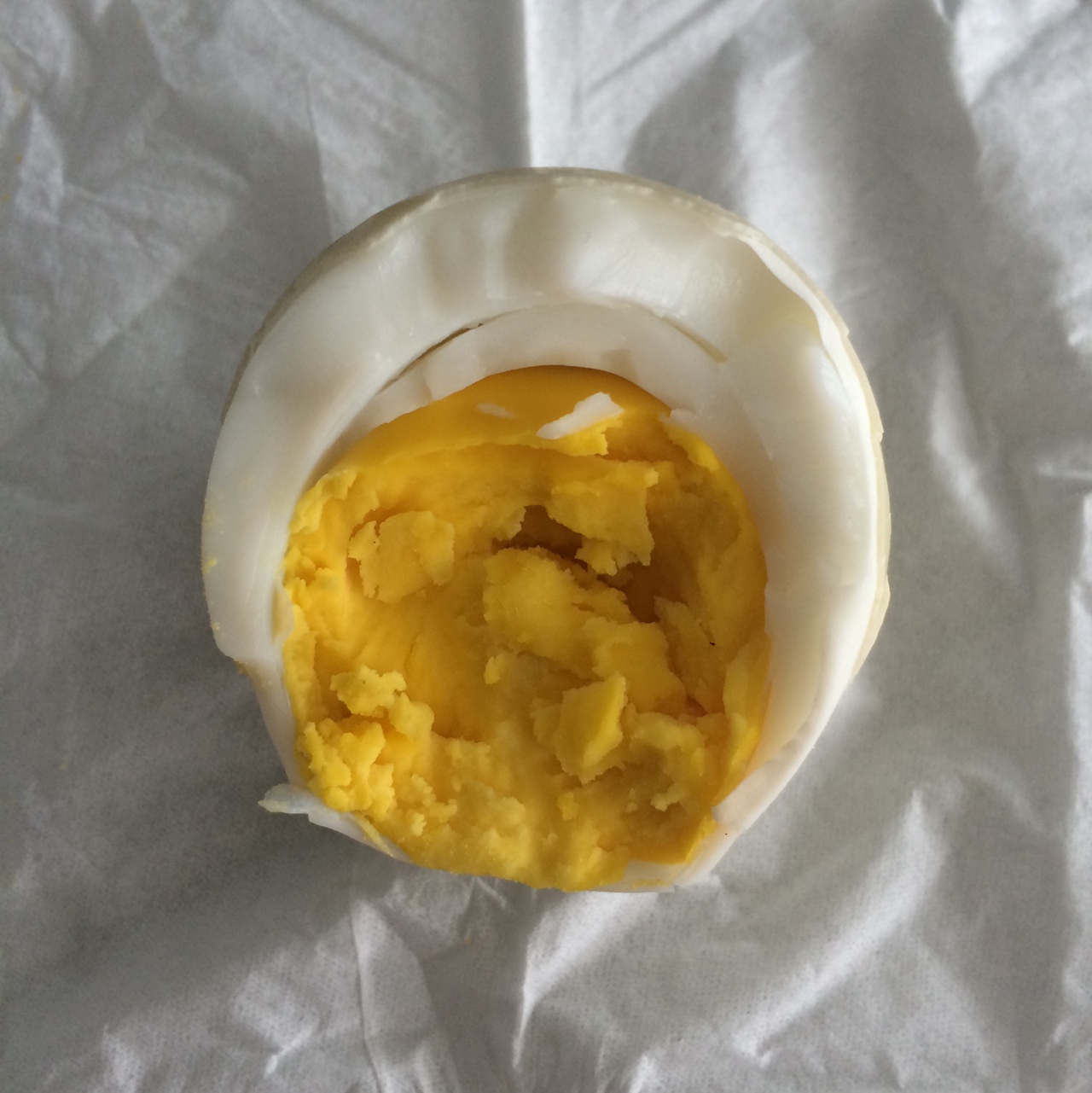 在公司食堂,和同事一人半个煮鸭蛋,半个咸鸭蛋,一碗粥,她吃完了,我剩这半个鸭蛋撑不进… #早餐...