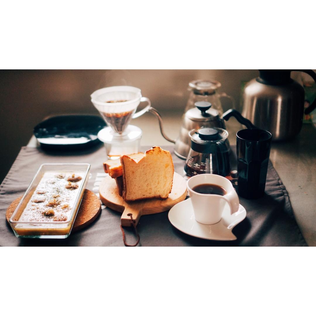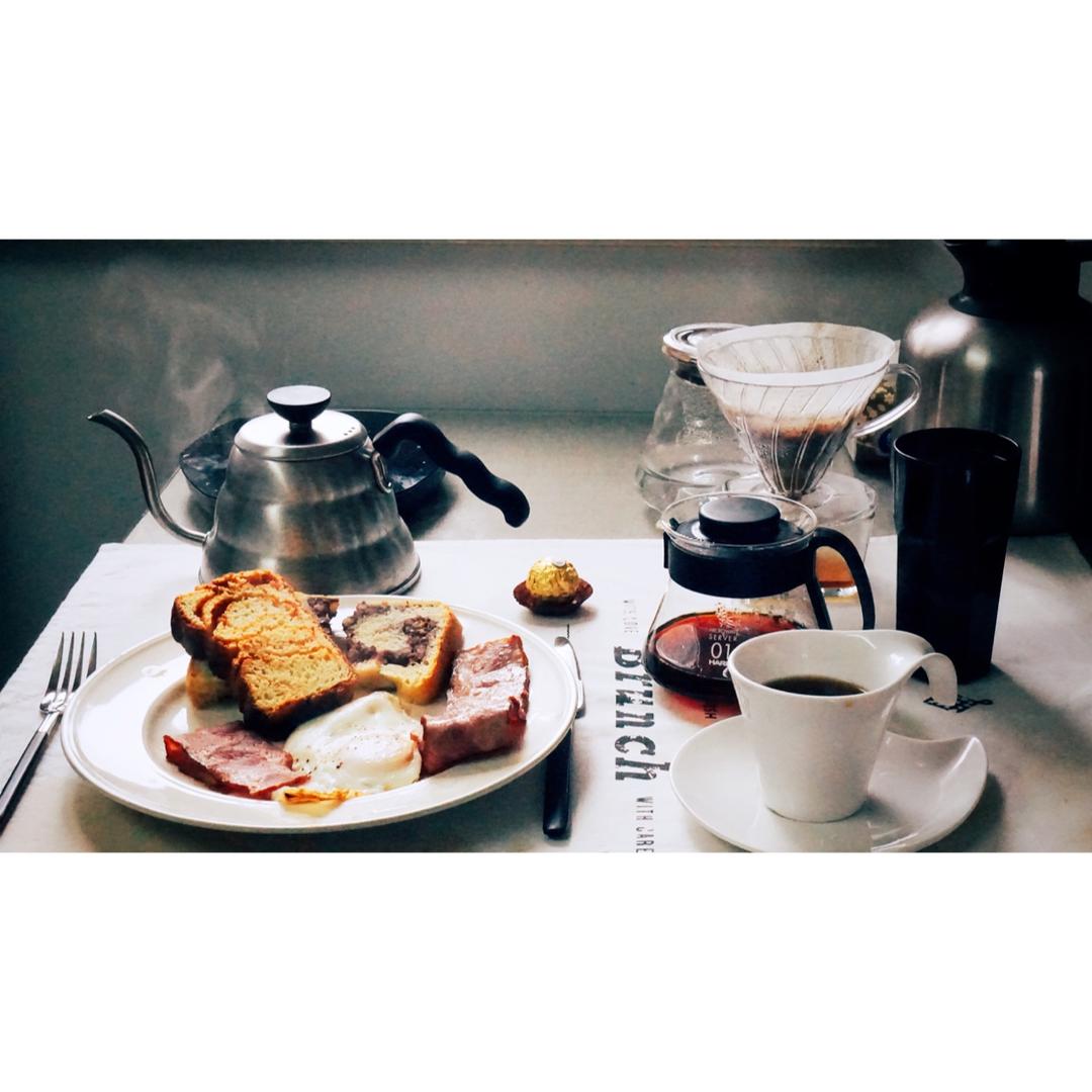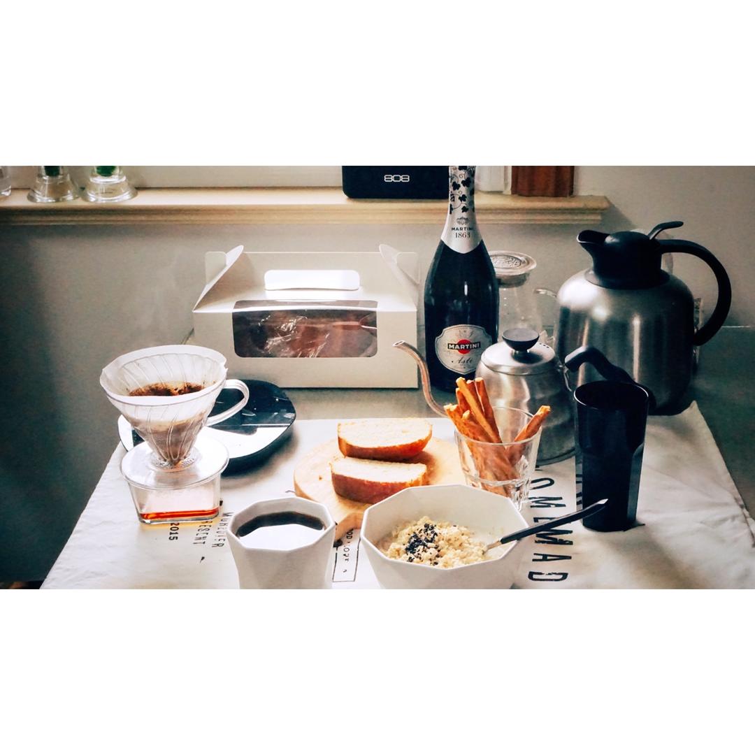 面包、麦片、近期热衷的蒜香橄榄油百力滋、手冲咖啡。