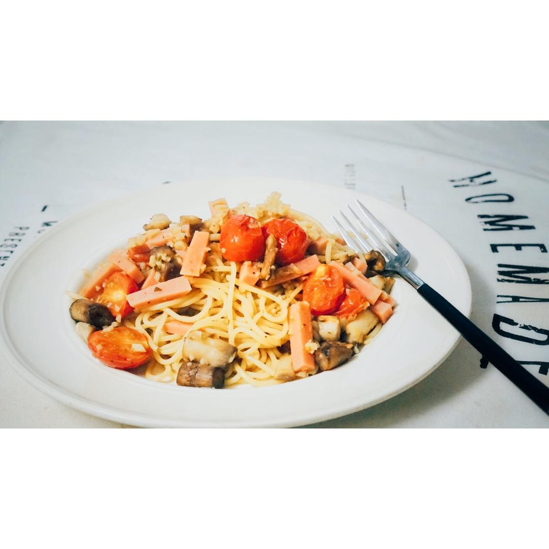 用蒜香焗蘑菇的汤汁做意面。如我设想的好吃😋