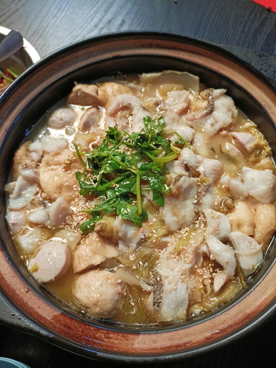 ①准备好一条切好的鲈鱼🐠 (提前腌好),和配菜(油豆腐,豆芽,金针菇,肉丸,一点白菜,配菜随自...