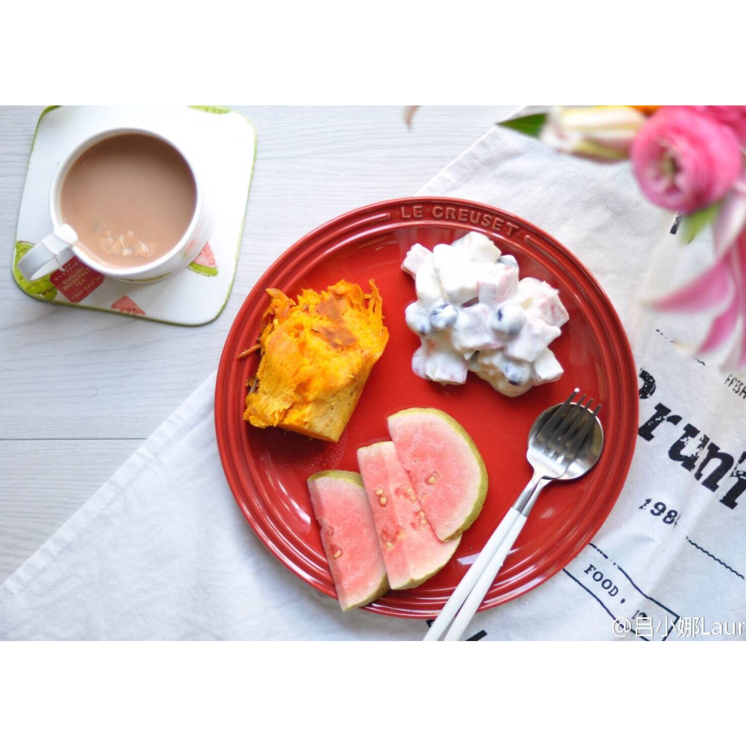 雪域水果沙拉,烤红薯,芭乐,红茶~~周末愉快