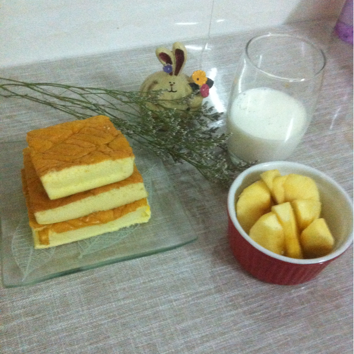 两个晚上都打球赛 回到家都十一点左右了 今天早餐省事点:黄金蛋糕(冷藏后更嫩滑) 苹果 牛奶 球赛打完了...