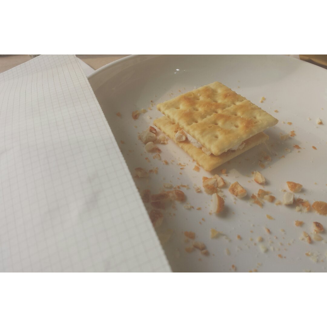 妈呀棉花糖+坚果+苏打饼烤出来的夹心饼干真的超好吃!!还剩下一块了拍个照😠
