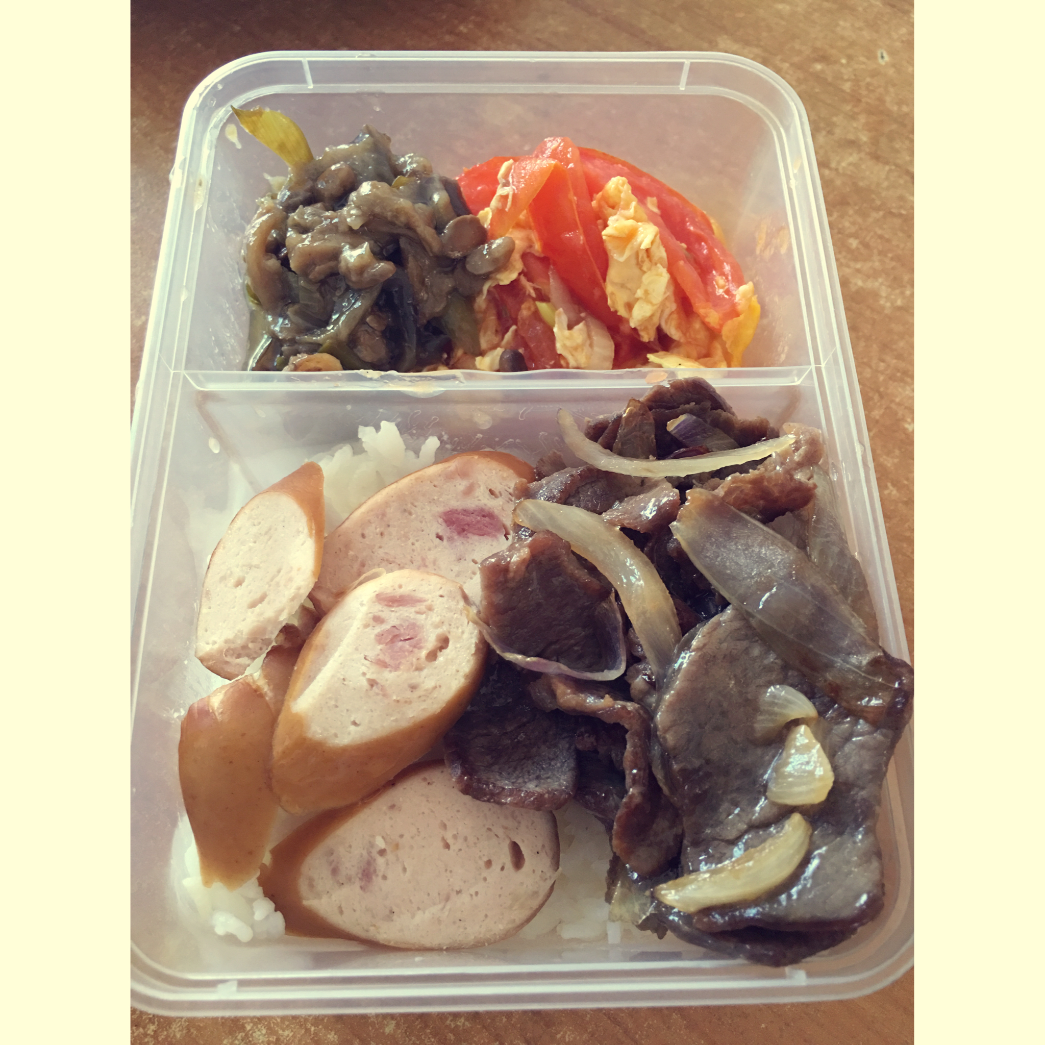 每日自备盒饭系列,酱茄子,番茄炒蛋,鸡肉香肠,洋葱羊肉
