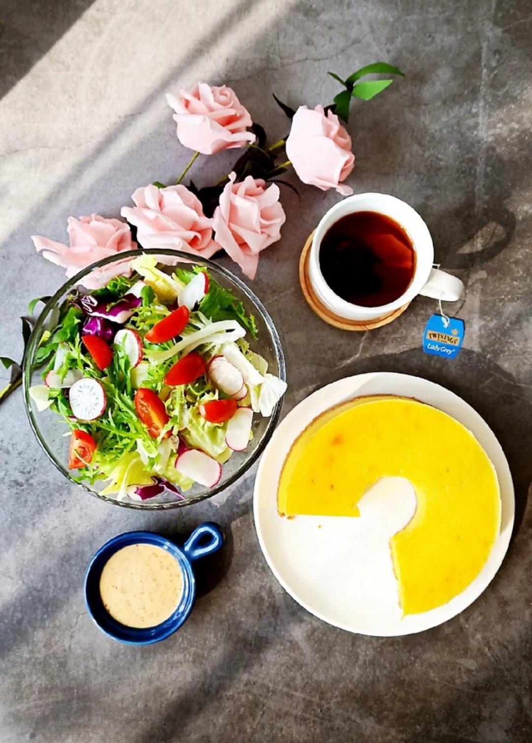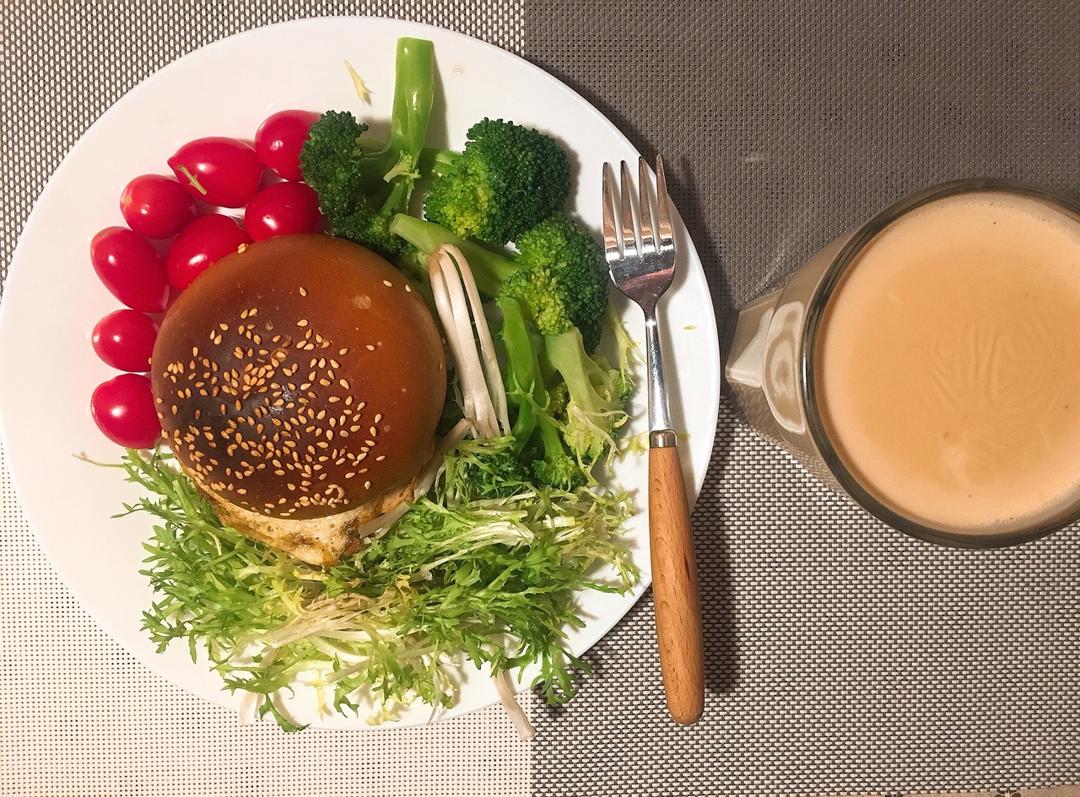 自制汉堡,里面夹的是姬松茸,萨拉米和煎蛋,蔬菜沙拉+油醋汁,自己煮的奶茶