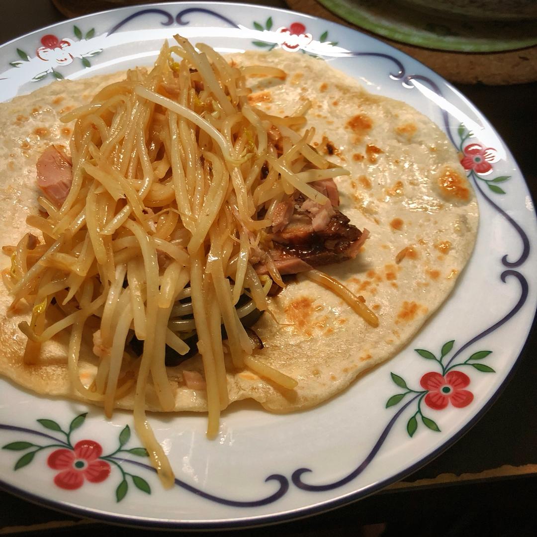 买了酱肘子和春饼,炒了土豆丝和豆芽,虽然春饼没有自己做的好,还是咬咬春~