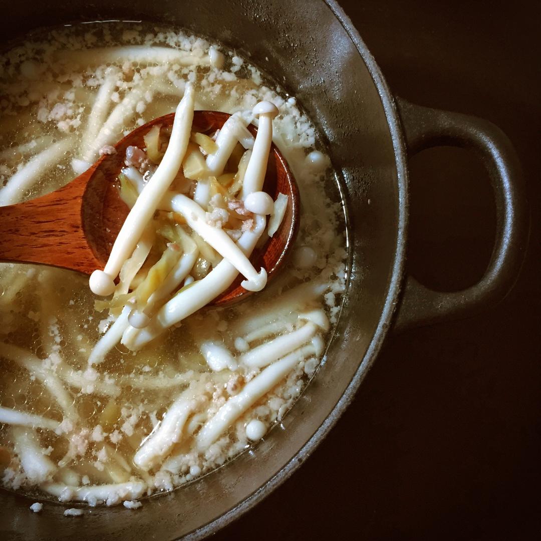 实在太好喝了!鱼泉榨菜和白玉菇简直配一脸!!因为无肉不欢的某只放了点肉末~