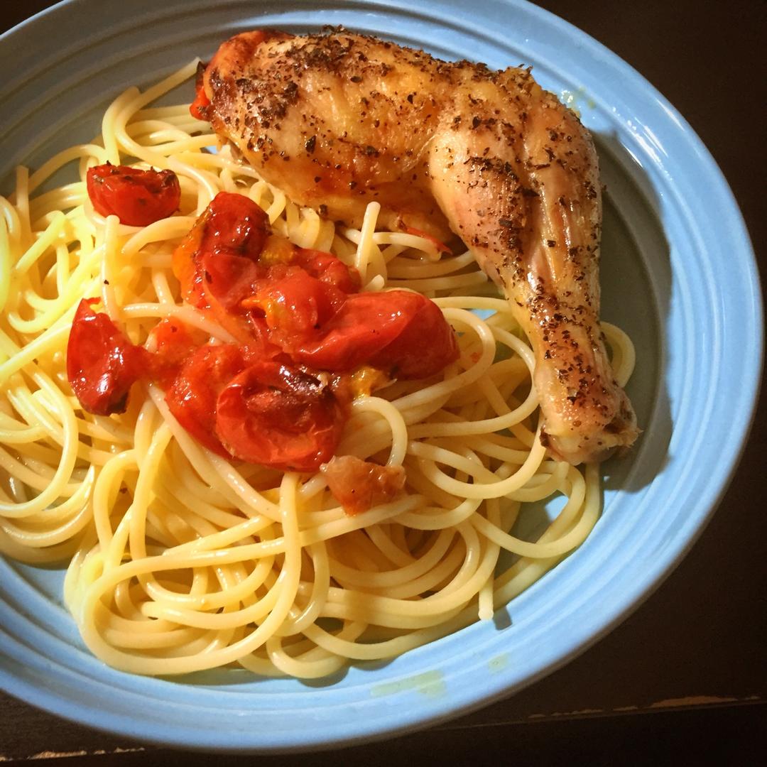 混合番茄汁鸡油的汤汁拌意面简直好吃到爆炸!!脆脆的微咸鸡皮搭配嫩嫩的鸡肉,简直是味蕾的双重满足呀! #晚餐•2017年4...