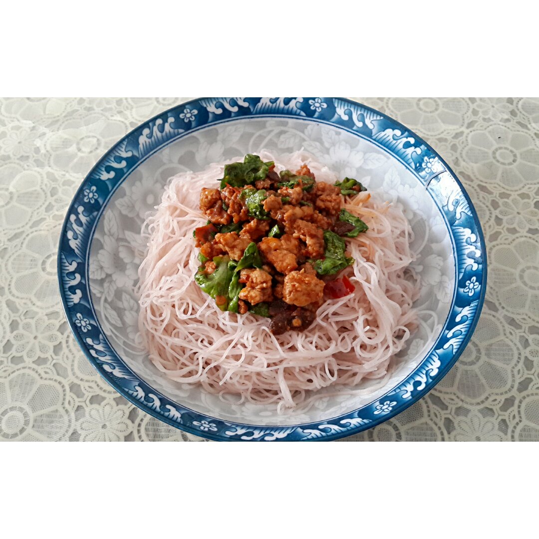 糙米粉+郫县豆瓣酱炒肉丁生菜(自创炒法 ( • ̀ω•́ )✧哈哈) 没想到好...
