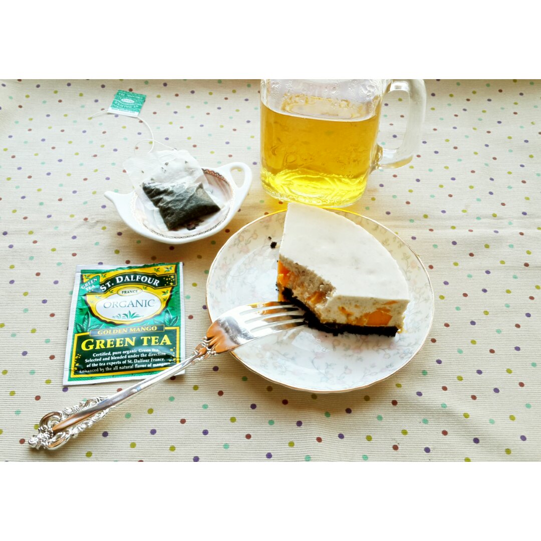 早安安(๑•̀ω•́๑)奥利奥芒果冻芝士蛋糕+圣桃园金芒果绿茶🍵