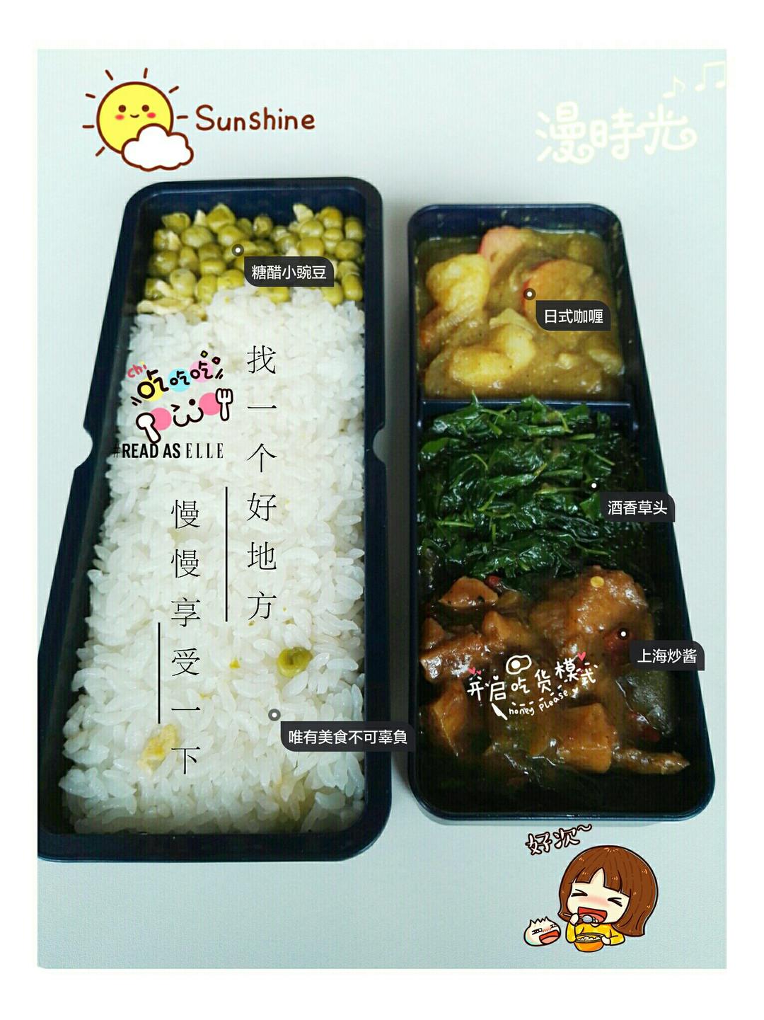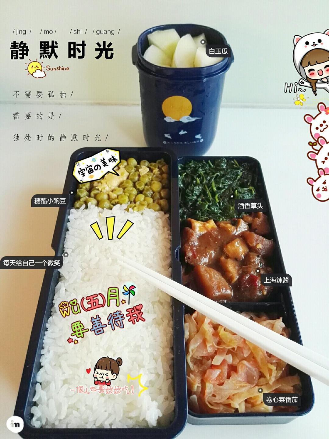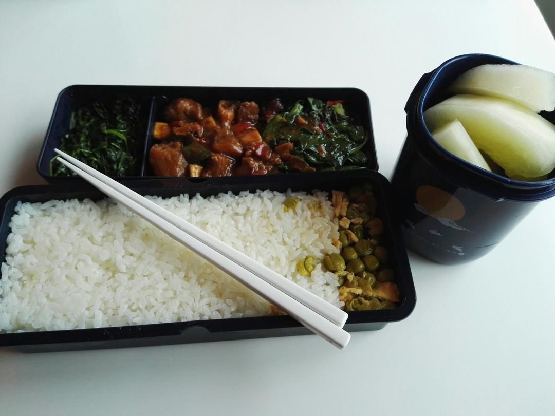 继续便当,酒香草头,上海炒酱,水煮鸡毛菜,水果是白玉瓜😉😉...