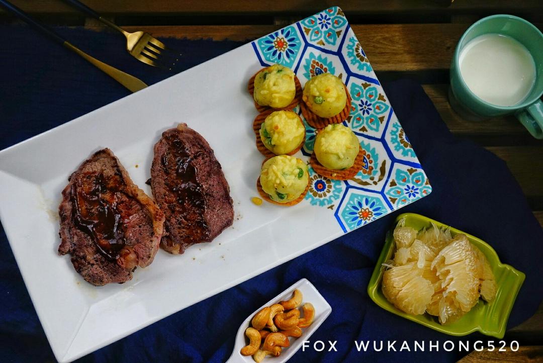 今日早餐:(黑胡椒牛排+土豆泥+腰果+柚子+牛奶)
