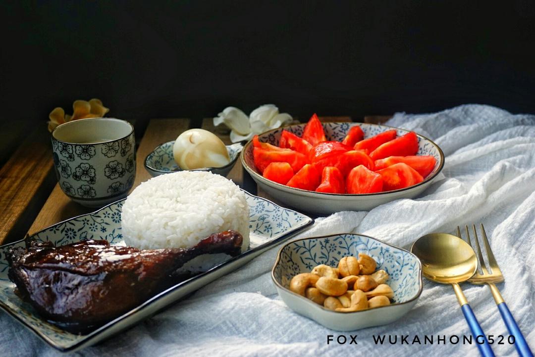 今日早餐:(红烧肉饭+糖水番茄+养乐多+桃子)(椰蓉月饼+生姜茶)