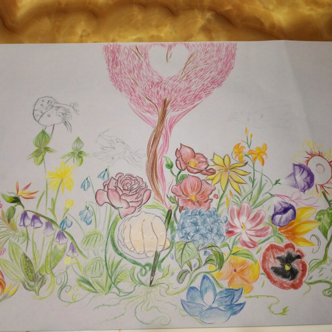 儿子的画,未完成稿,剩下的明天带去学校完成,然后上交。很喜欢这些花儿,拍照留念😍