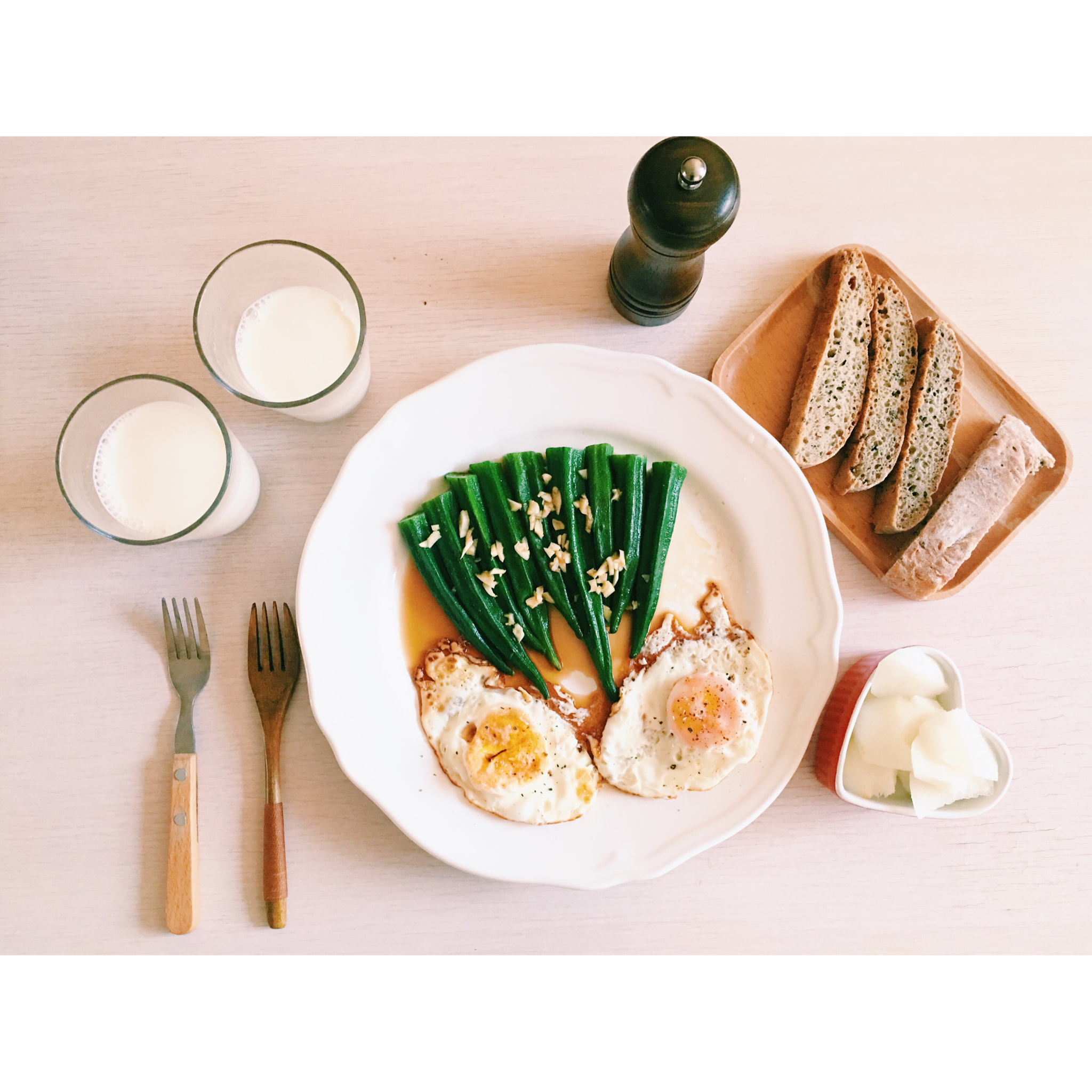 2016.3.29 白灼秋葵,煎蛋,全麦黑芝麻面包,牛奶,🍐。☀️