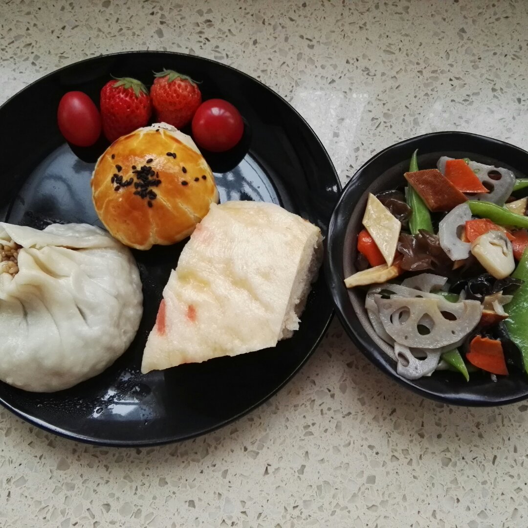 女儿的早餐~~~~自制蛋黄酥和素什锦,富春茶社的千层油糕和烧卖。