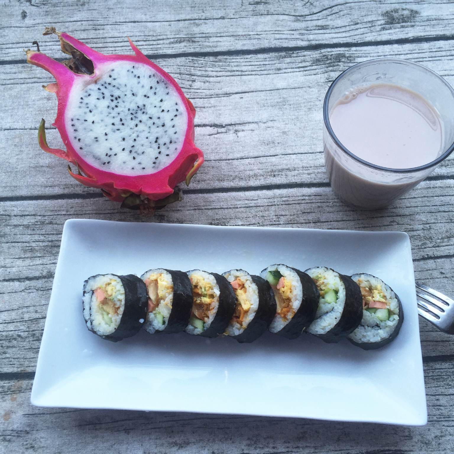 宝贝晨食 寿司 火🔥龙果 五谷豆浆 ^_^