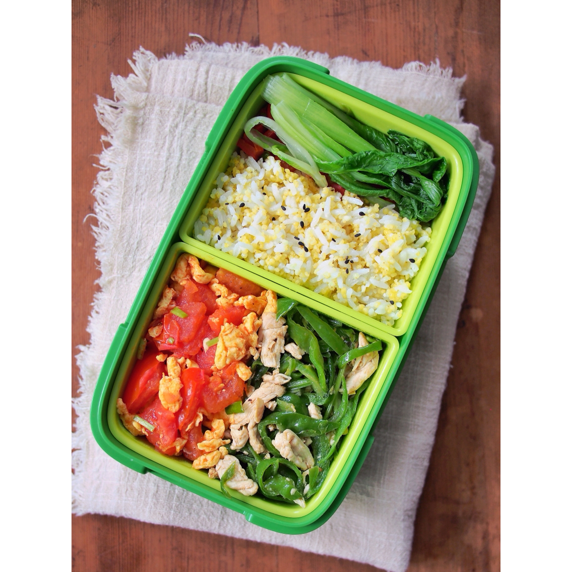 番茄炒鸡蛋,青椒肉丝,白菜,底下是红椒和生菜,天气转凉,注意保暖😁