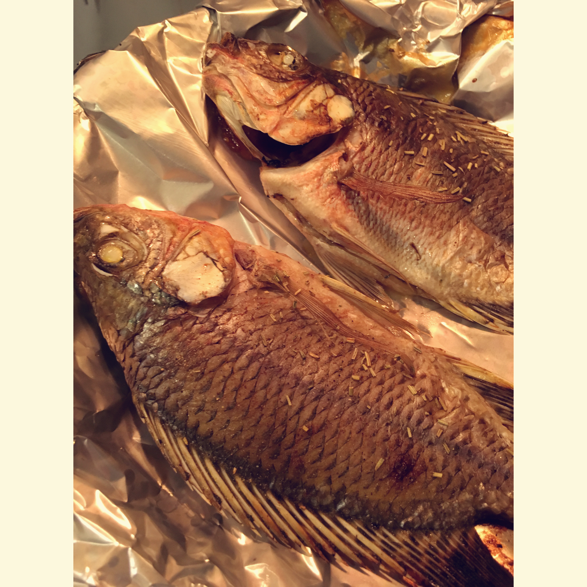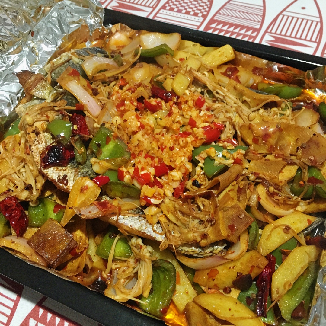 我買的魚沒有2斤,烤的中途拿出戳了戳,最終少烤了8分鐘。放完配菜之後用剁椒炒了蒜蓉鋪了些在上面,蒜香濃郁! #晚餐•20...