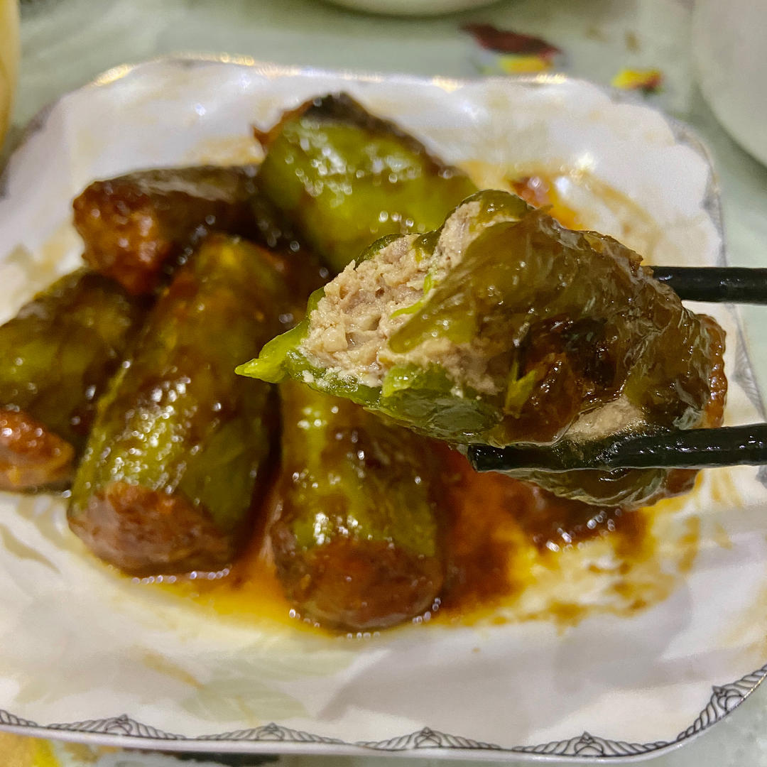 虎皮椒酿肉,淋上糖醋蒜汁后很是下饭。