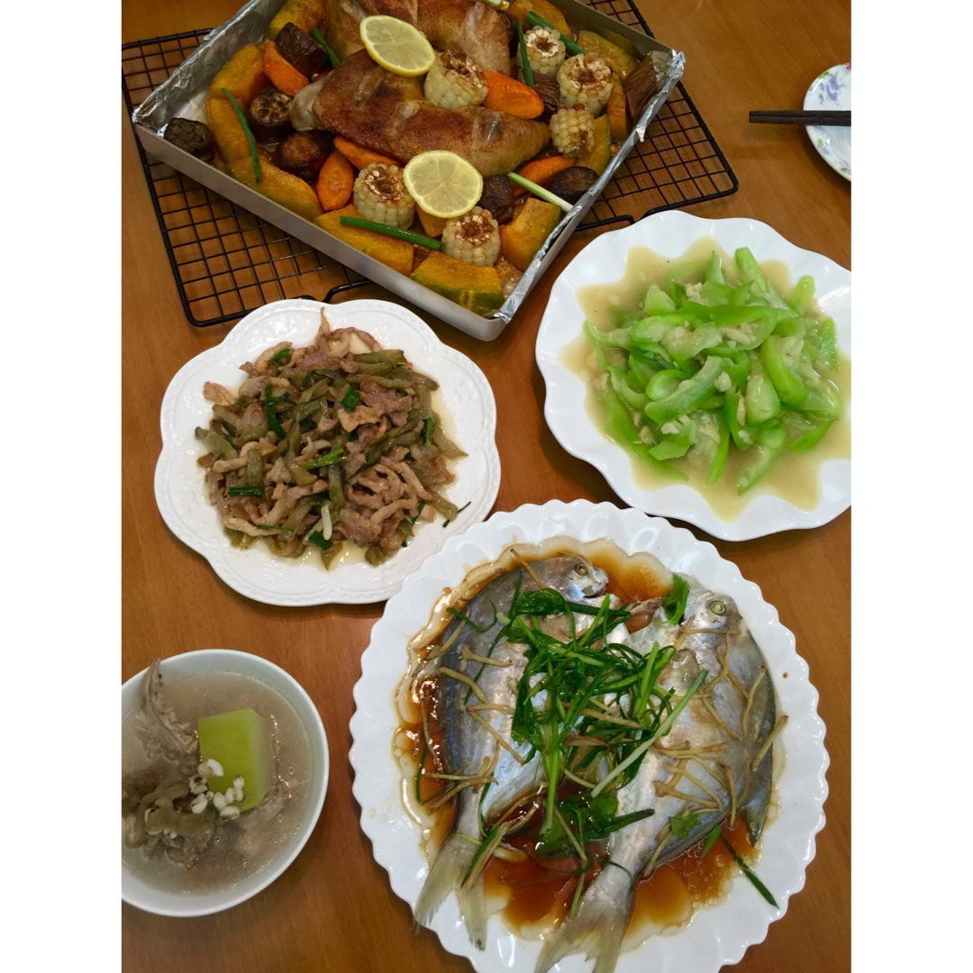菲家的美味晚餐:孜然胡椒烤鸡腿蔬果、小斗枪鱼、炒榨菜肉丝、蒜蓉炒丝瓜、冬瓜老鸭薏米汤