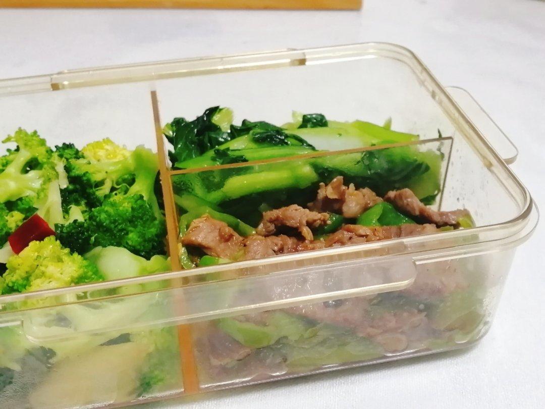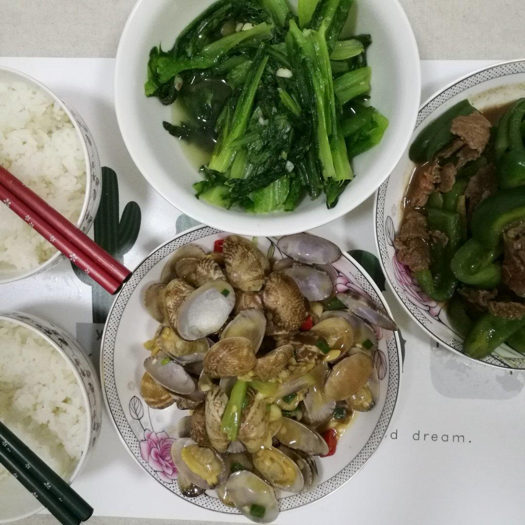 两个小菜,青椒炒牛肉和素炒娃娃菜,一个馒头老公吃一碗米饭我吃(南北方人的主食爱好)。清爽满...