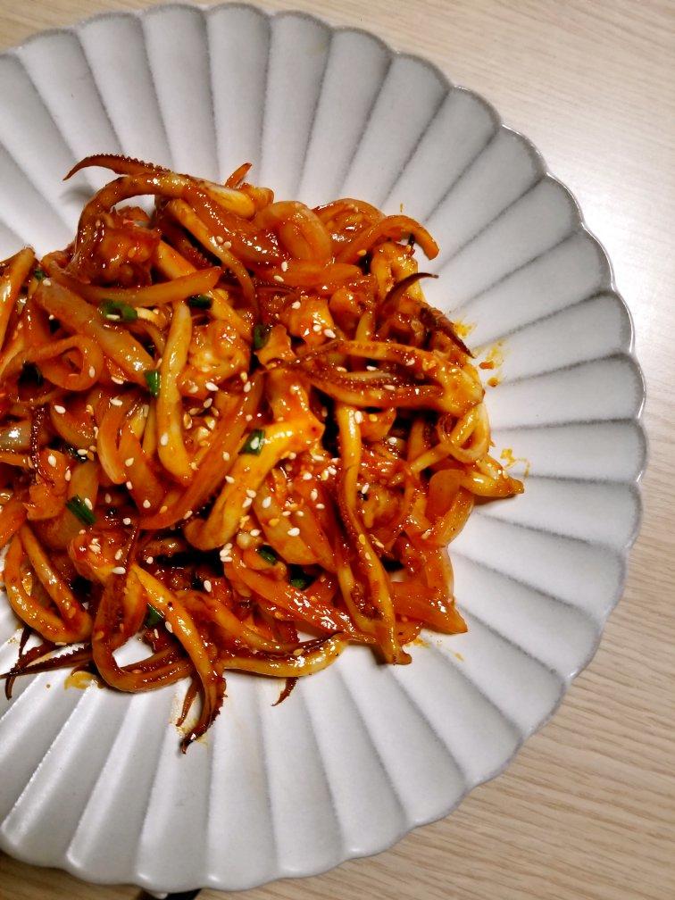 韩式辣酱炒鱿鱼须。处理鱿鱼的过程最爽,一撕到底的黑皮,露出吹弹可破的白肉,那感...