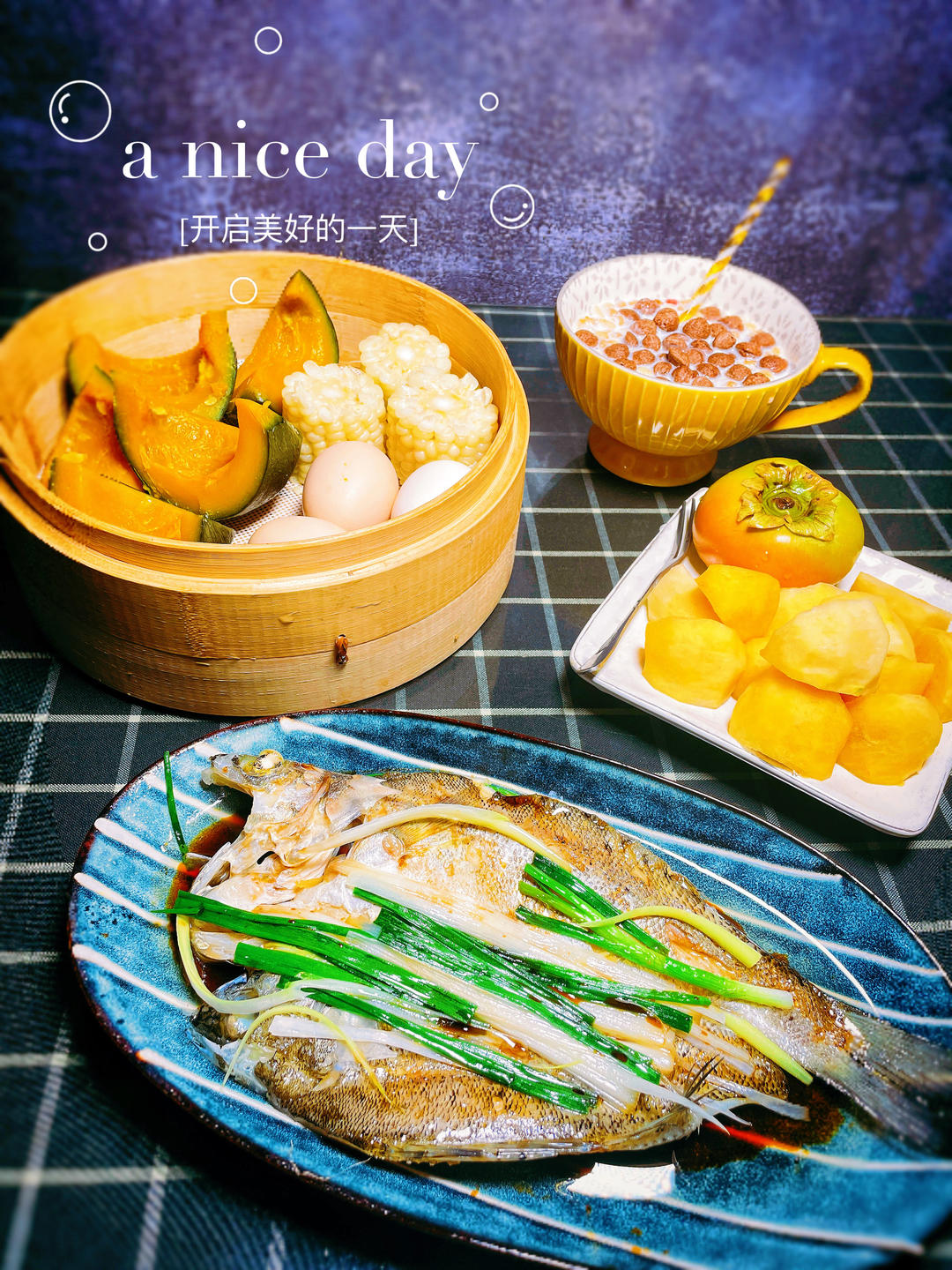 高中生早餐:蒸海鲈鱼、蒸南瓜🌽玉米鸡蛋🥚、脆柿子、羊奶麦片