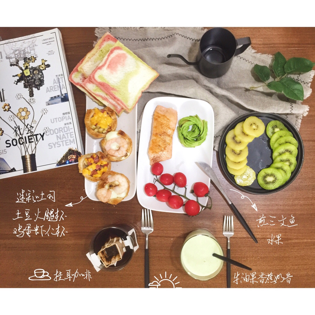 周末早午餐,迷彩吐司简直太软萌啦!用没吃完的几片全麦吐司做了吐司杯,今天的三文鱼煎的好淡,吃了几口没吃完呵呵哒 #午餐•...