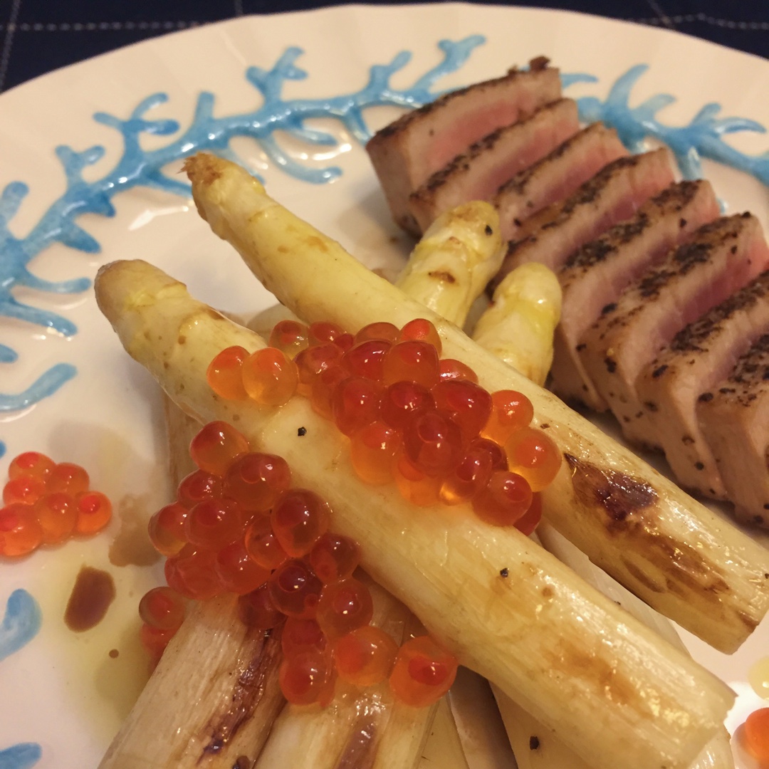 今天在avocado lady买到了新鲜的白芦笋 迫不及待做了晚餐 我的黑胡椒煎封金枪鱼配白芦笋和鲑鱼子 老公的肋眼 刚...