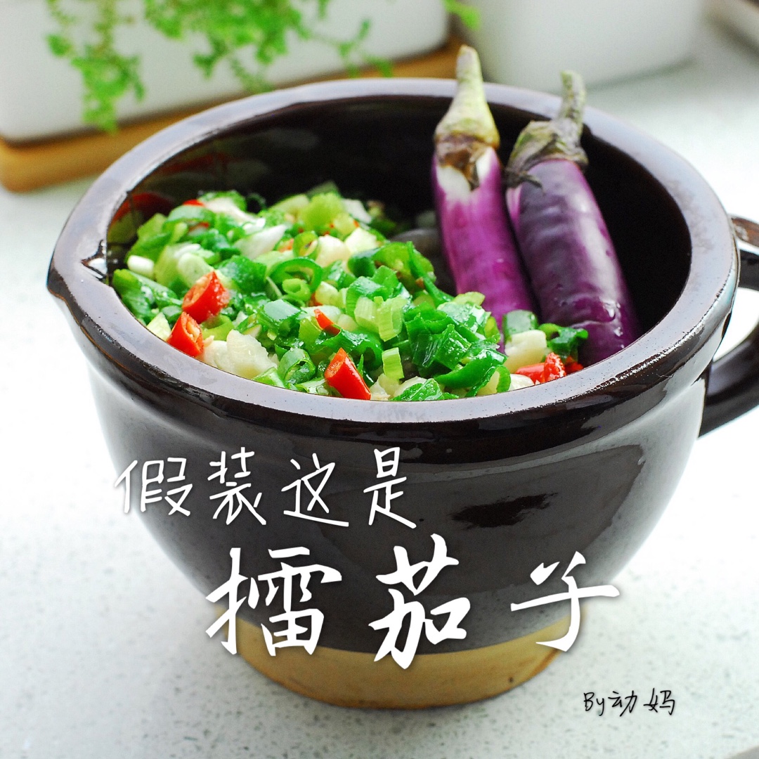 这个不是正宗做法😄,上面两个茄子头是装饰。动妈做法就是把茄子蒸熟,然后加小米辣、小青椒、蒜末、葱末,把油烧热浇在配料上面...