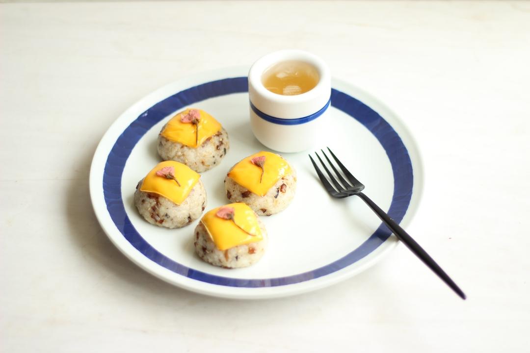 樱花梅子奶酪烤饭团+青梅糖浆兑冰水。今天这一盘好搭~
