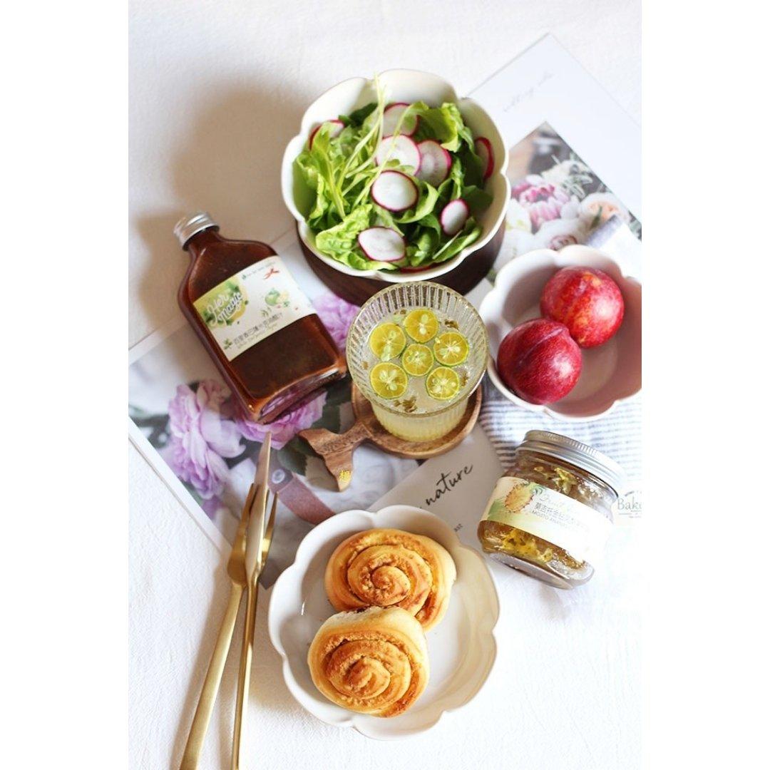 一人食。用红糖肉桂核桃卷的手法做了蛋黄肉松卷,整形简单烤好满屋子面包香,很好吃。用莫吉托金铅凤梨果茶酱和小青...