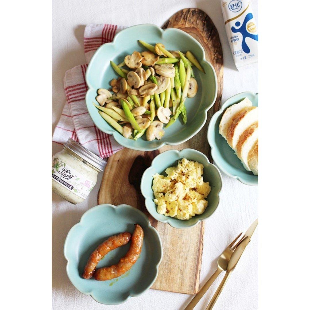 椰浆面包抹上留兰香薄荷酸奶沙拉酱,烤了芝士肠,美式滑蛋,黄油香煎芦笋口蘑…所以有看出我今天起好早的#一屋两人...
