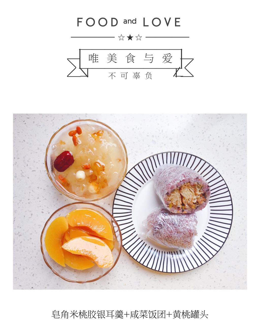 早餐:皂角米桃胶银耳羹+咸菜饭团+黄桃罐头