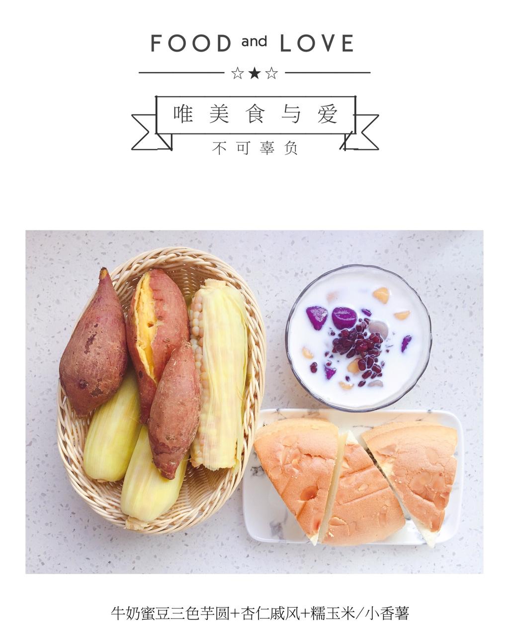 早餐:牛奶蜜豆三色芋圆+杏仁戚风+糯玉米/小香薯