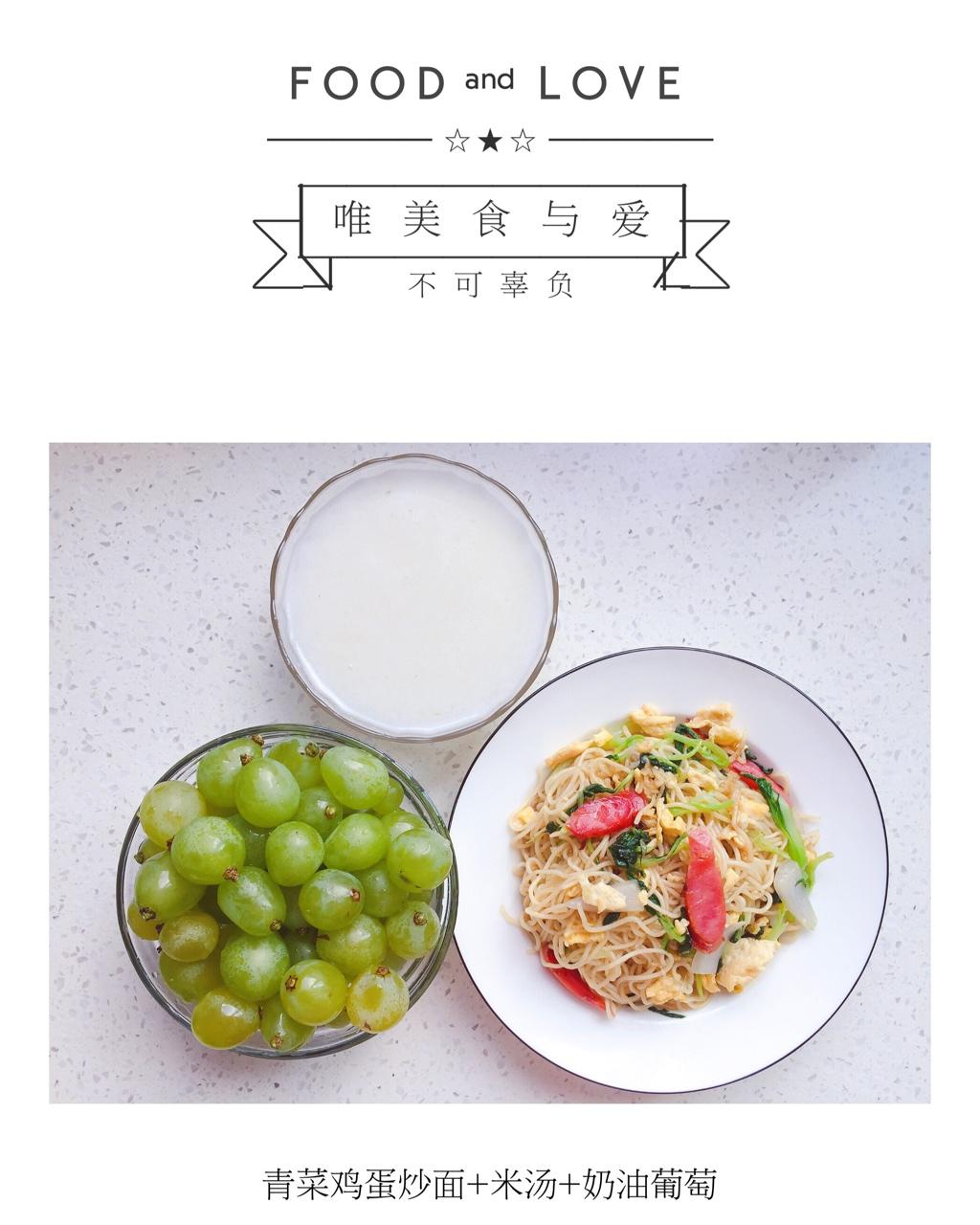 早餐:青菜鸡蛋炒面+米汤+奶油葡萄