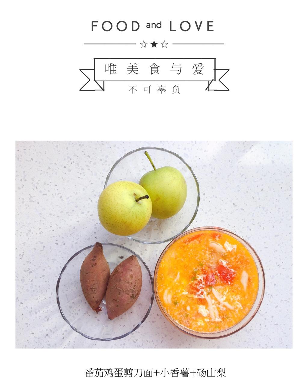 早餐:番茄鸡蛋剪刀面+小香薯+砀山梨