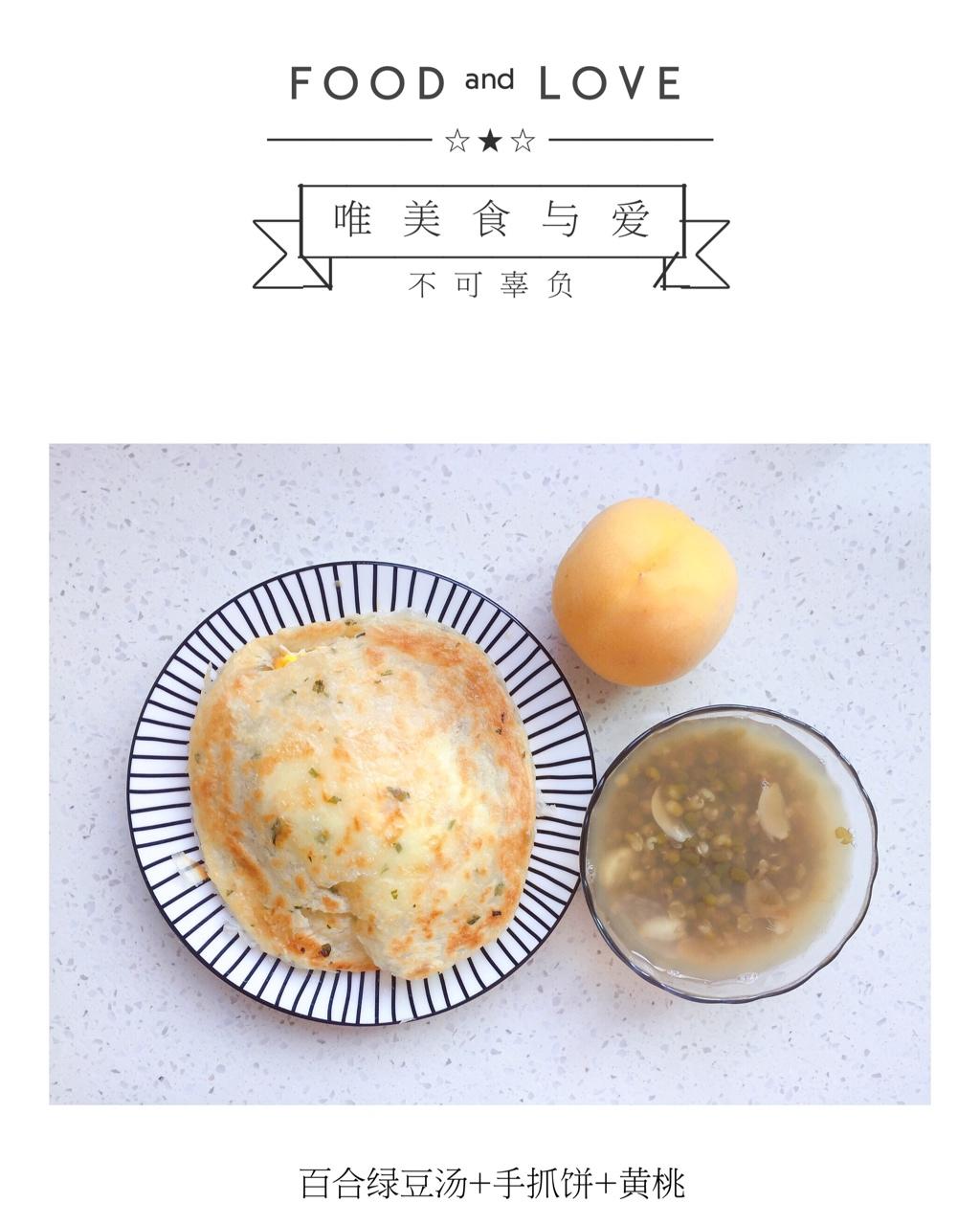 早餐:百合绿豆汤+手抓饼+黄桃
